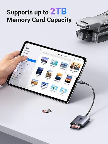 • 【Plug and Play】No requiere aplicación exacta, controlador y energía. Este lector de tarjetas SD para iPad se conecta a su computadora portátil/iPhone/iPad y le permite compartir su vida con familiares y amigos en cualquier momento y en cualquier lugar. Es conveniente para que compruebe inmediatamente el video de cámaras de sendero, grabadoras de automóviles, cámaras de juegos, cámaras de ciervos, cámaras de seguridad privadas, drones